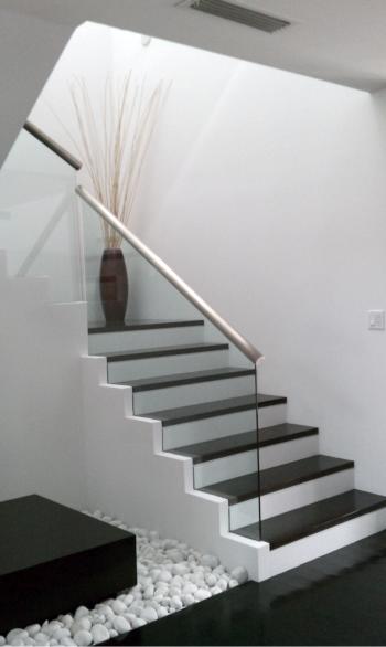 Glass railings with concealed shoe molding and 2" diameter top rail in